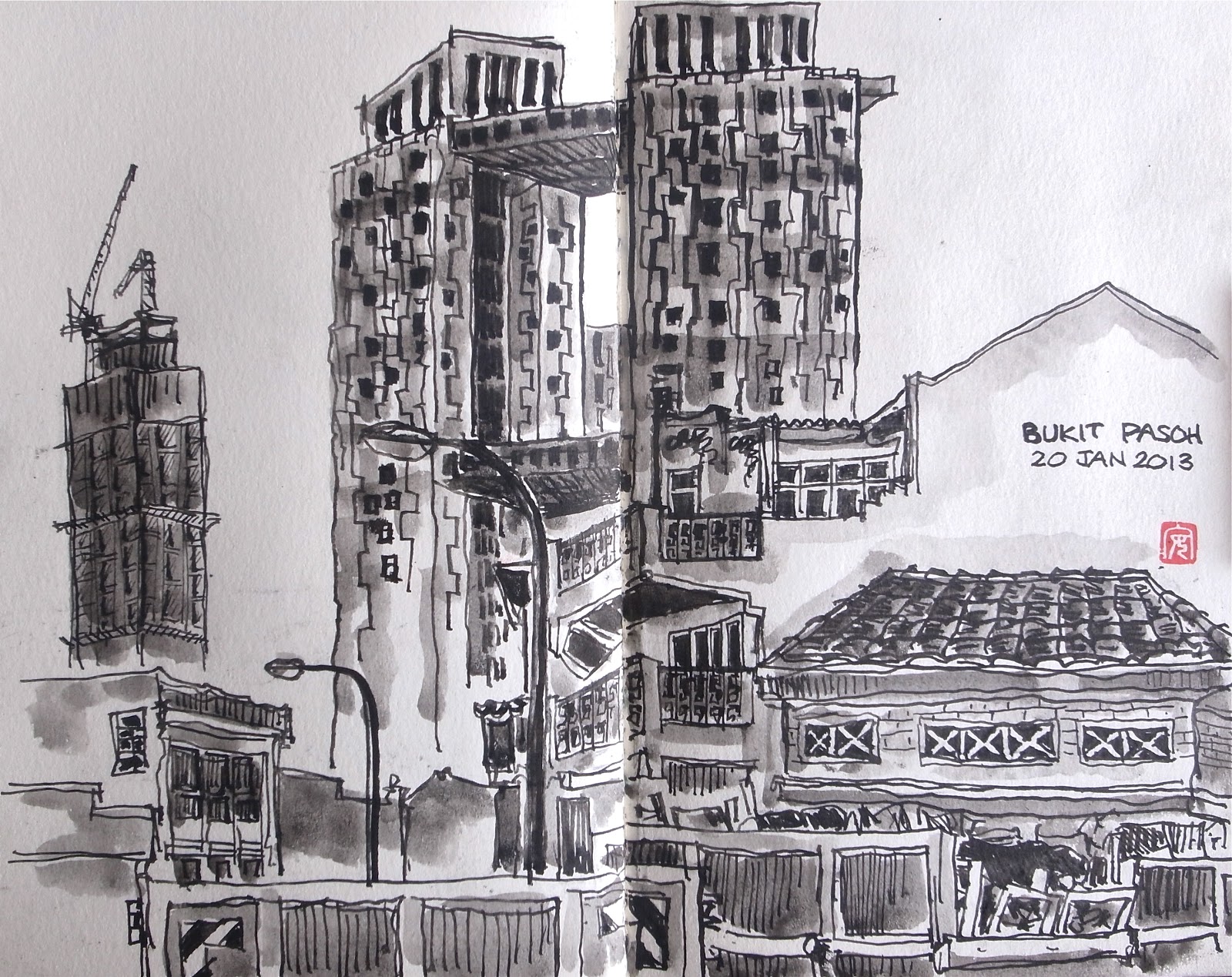Sun Plaza Park monsoon drain - Sketched with Pens and Ink Wash